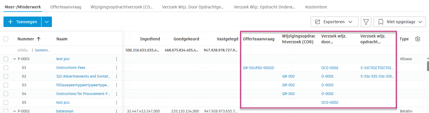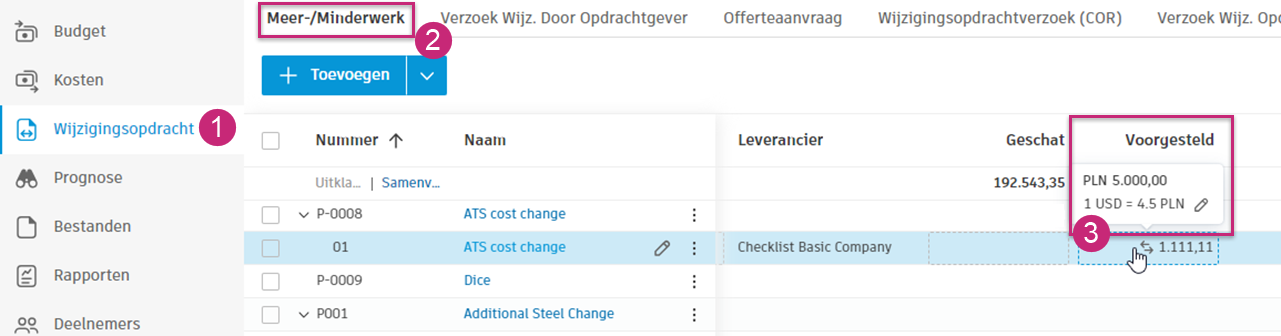 De tabellen met wijzigingsopdrachten bieden uitgebreide informatie over kostenposten, inclusief het bijbehorende nummer van de wijzigingsopdracht. Als u op een getal klikt, wordt u omgeleid naar het specifieke tabblad waar de bijbehorende wijzigingsopdracht zich bevindt. Er wordt een vervolgwerkpaneel met meer informatie geopend.