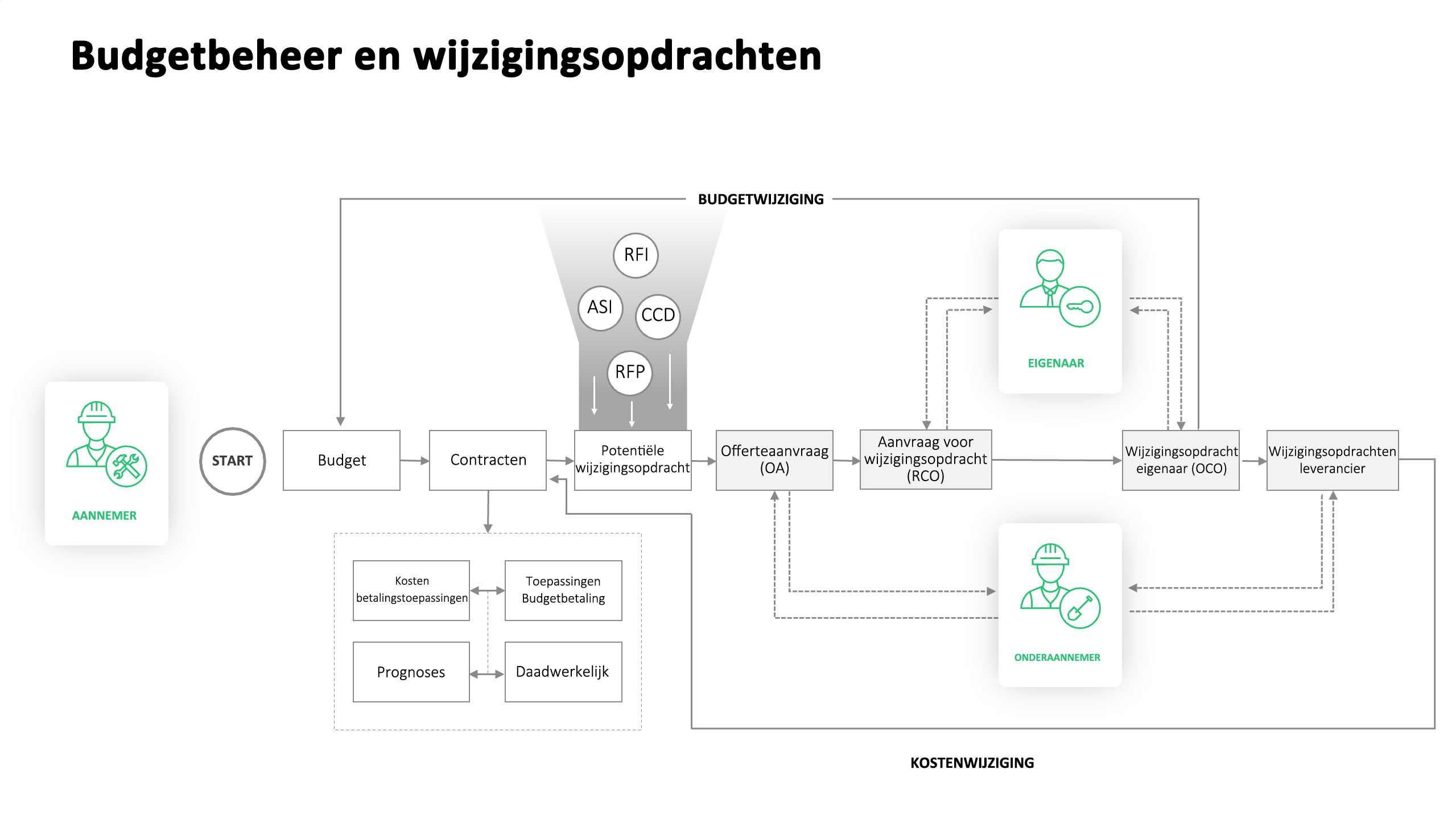 Maak kennis met de basisworkflow voor wijzigingsopdrachten die onderdeel is van de workflow voor financieel kostenbeheer: