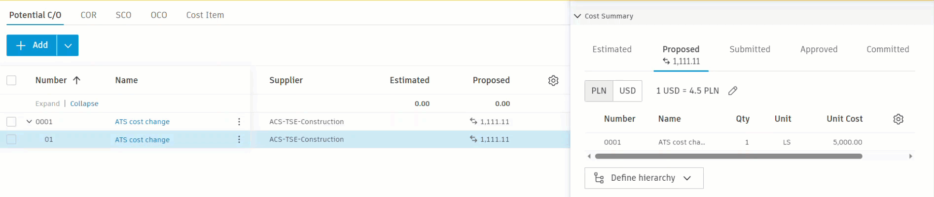 Zodra de vreemde valuta is ingesteld, kunnen wijzigingsopdrachten worden ingevoerd en beheerd in de valuta van de buitenlandse leverancier naarmate het project vordert. Het systeem zal automatisch de valutaset voor een leverancier binnen zijn contract herkennen. Wanneer een potentiële wijzigingsopdracht (PCO) optreedt, kan de leverancier (met het juiste machtigingsniveau) een PCO genereren.