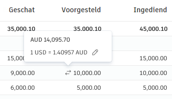 De begrote, ingediende en goedgekeurde waarden worden altijd in de basisvaluta ingevoerd. Toch zult u wijzigingen zien in de 'Voorgestelde' en 'Vastgelegde waarden'. De basisvaluta wordt weergegeven met het pictogram ernaast. Beweeg de cursor over de wisselkoers om deze te bekijken of te bewerken: