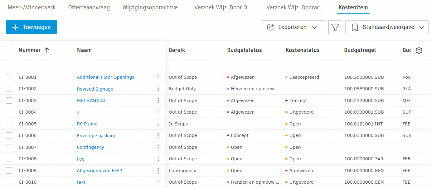 Kostenposten zijn afzonderlijke items in een wijzigingsopdracht die zijn gekoppeld aan gekoppelde budgetten en contracten. Ze kunnen op meerdere manieren worden weergegeven: dynamisch gegroepeerd en gefilterd in het tabblad 'Kostenpost'.