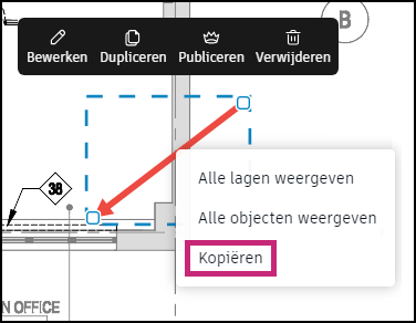U kunt markeringen kopiëren en plakken naar dezelfde of een andere bouwtekening of bestand in uw huidige project of naar een ander project.