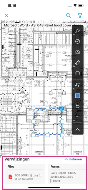 In de Autodesk Construction Cloud mobile app kunt u verwijzingen naar andere bouwtekeningen, bestanden, RFI's, formulieren, indieningen en objecten toevoegen aan een aantekening.