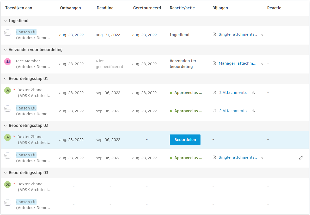 Beoordelingsvolgorde: vereiste beoordelaars krijgen prioriteit en worden duidelijk gemarkeerd, gevolgd door optionele beoordelaars