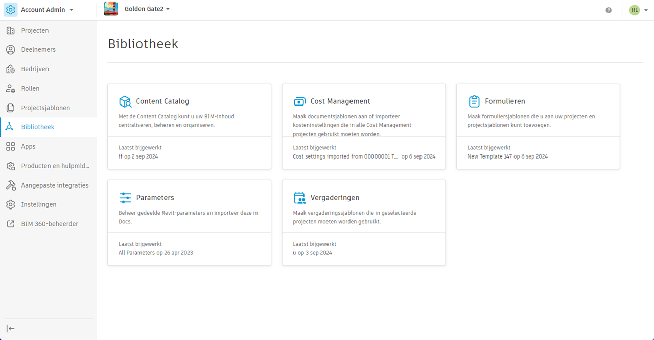 Het hulpmiddel‘Bibliotheek’ in Account Admin is een gecentraliseerde verzameling met Assets die in projecten en projecttemplates in een account kunnen worden gebruikt.
