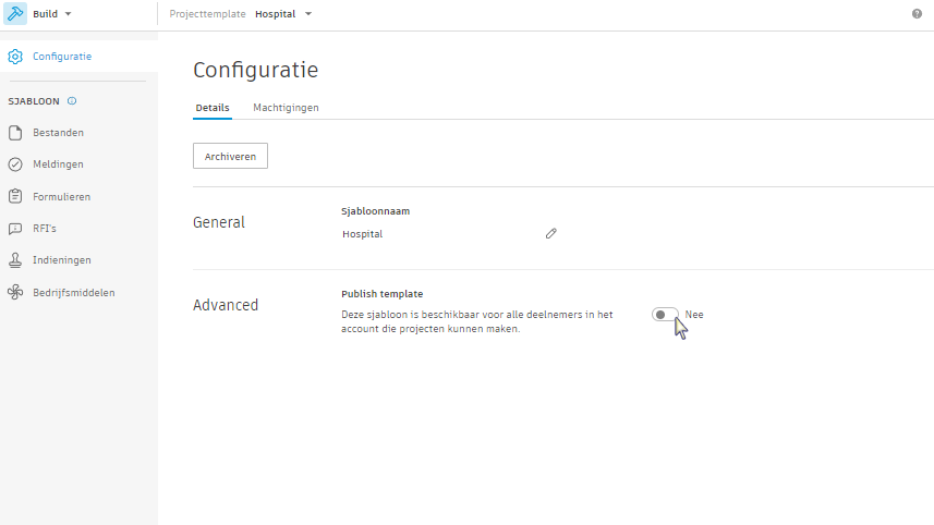 Projecttemplates: als het project is gemaakt op basis van een template, wordt de naam van de projecttemplate weergegeven als een koppeling. Als de template niet meer actief is, wordt deze weergegeven als gearchiveerd.