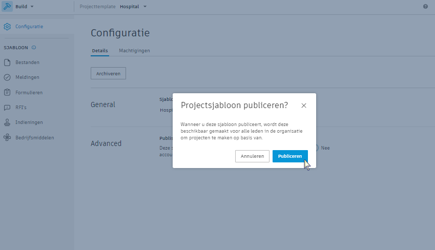 Wanneer het vak Projecttemplate publiceren? wordt weergegeven, klikt u op de knop Publiceren.
