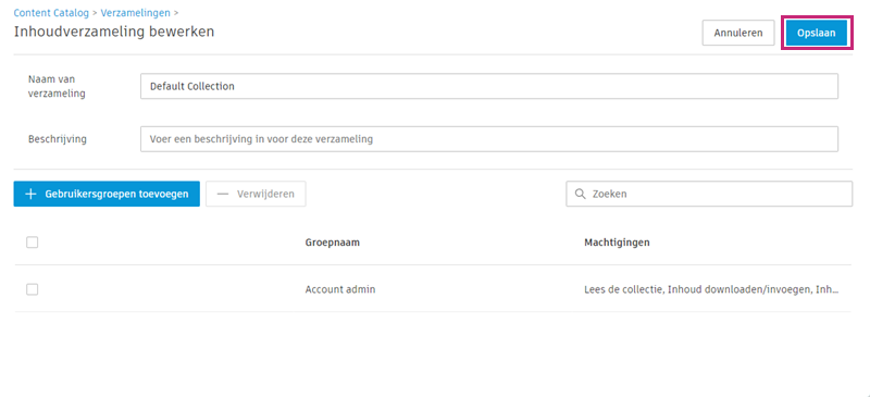 Klik op Gebruikersgroepen toevoegen om in te stellen wie de inhoud in deze verzameling kan zien en gebruiken.