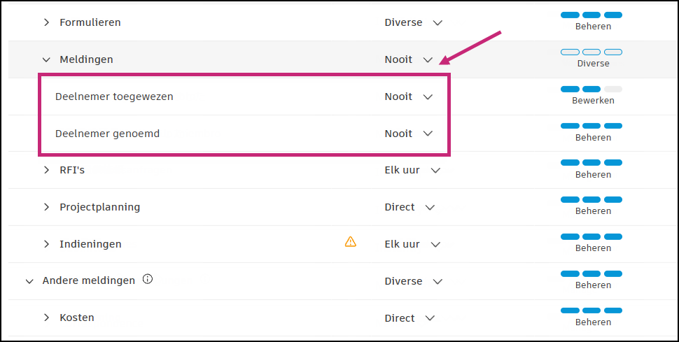 | Beheren | Deelnemers kunnen de frequentie-instellingen weergeven en bewerken. Daarnaast kunnen deelnemers Issues voor hulpmiddelen en issuestypen uitschakelen. |