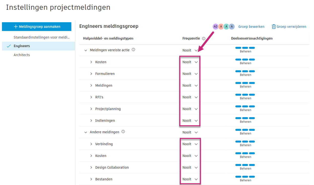 Projectbeheerders kunnen standaardinstellingen voor Issues gebruiken of issuesgroepen maken van individuele deelnemers, rollen of bedrijven. Vervolgens kunnen ze de frequentie van e-mailissues en machtigingsniveaus beheren voor geselecteerde hulpmiddelen en issuetypen in elke groep.