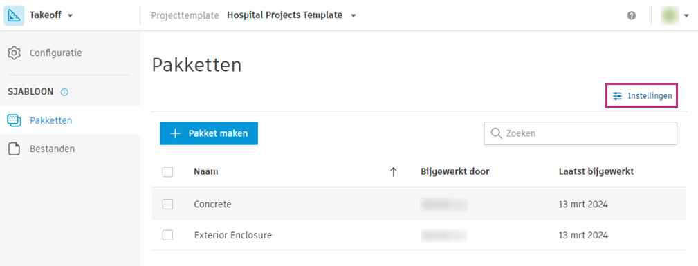 Wanneer de instellingen voor de projecttemplate zijn geconfigureerd, ga terug naar de pagina Pakketten via de linkerkant om calculatiepakketten voor de template te maken. Dit proces is vergelijkbaar met het aanmaken van meetstaat opmaakpakketten in een normaal project.