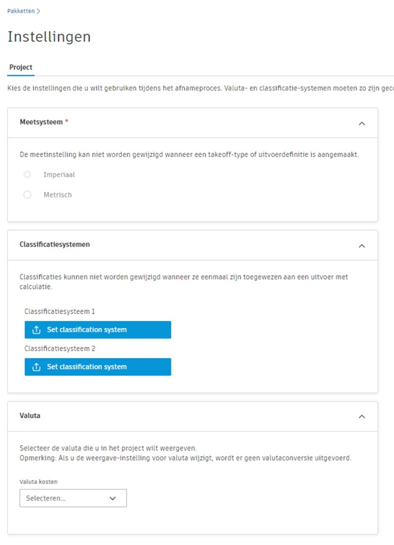 Klik in de rechterbovenhoek van de pagina ‘Template’ > ‘Pakketten’ op Instellingen om projectinstellingen te definiëren, zoals maten, classificaties en de valutaweergave voor de projecttemplate. Deze instellingen zijn van toepassing op alle calculatiepakketten die zijn gemaakt in projecten die deze template gebruiken.