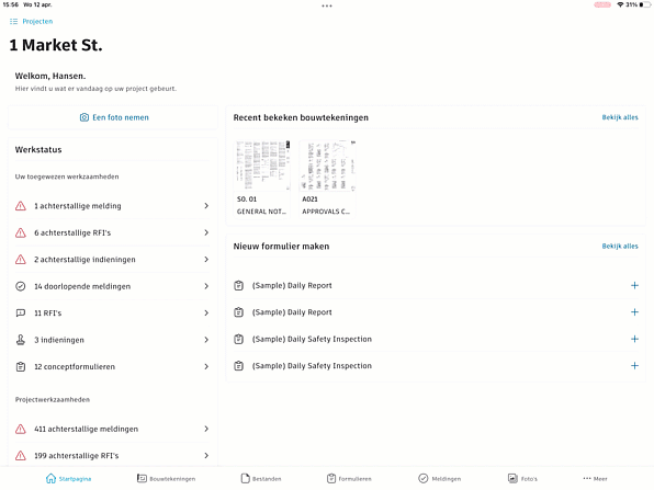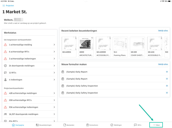 Tik op de relevante tool, zoals Issues, RFI's, Indieningen of Foto's.