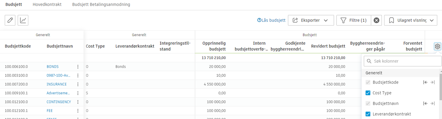 For detaljert visning av kontraks-SOV kan kolonnemodusen også vise opprinnelige budsjettrelaterte kolonner hvis Ett budsjett til flere kontrakter ikke er valgt.