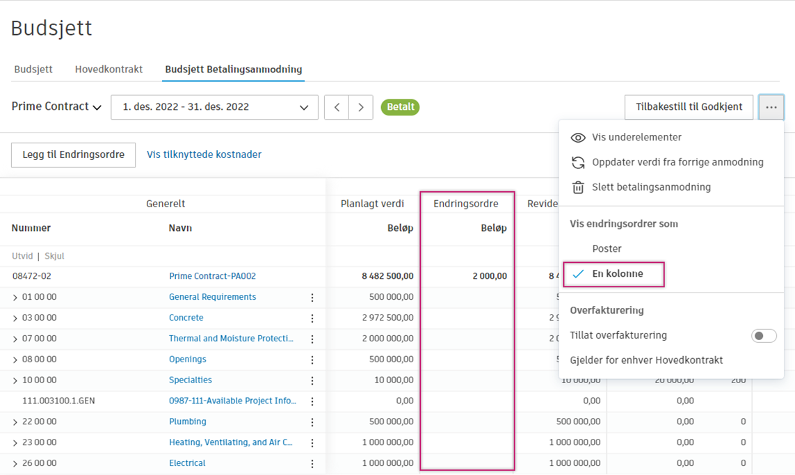 For hovedkontrakt og budsjettbetalingsapplikasjon viser kolonnemodus godkjente EO-er.