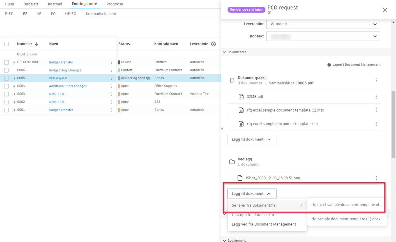 - Legg til fra EF: For endringsordreforespørsler (AE) og endringsordrer til leverandører (UE-EO).
