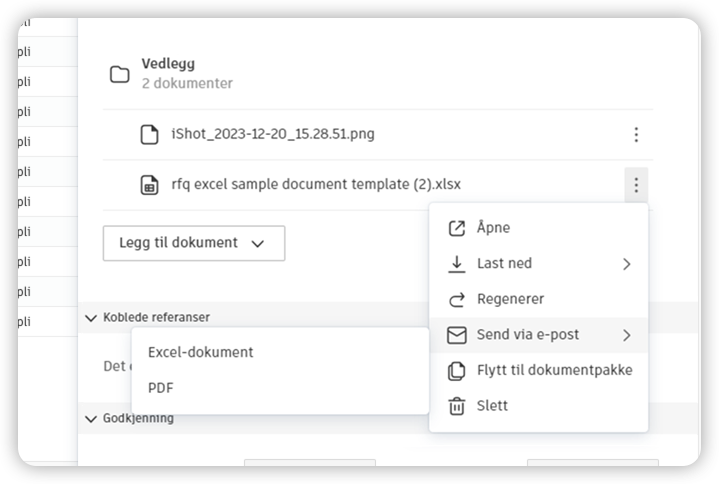 - Send via e-post for gjennomgang av alt tilknyttet omfang og dokumentasjon. Dokumentpakken vil bli sendt som et vedlegg. Hvis den overstiger 20 MB, oppgis en nedlastingskobling i stedet.