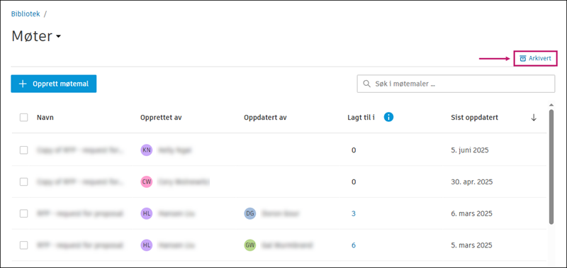 Arkiverte maler vil ikke lenger være tilgjengelige for bruk i prosjektene de legges til i. Arkivering av en mal vil ikke påvirke møter som tidligere er opprettet fra den.