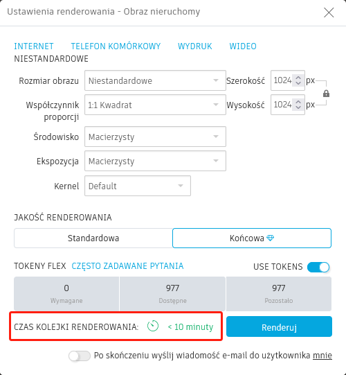 Renderingi oświetlenia naturalnego bardziej obciążają serwer i renderowanie trwa dłużej. Można skrócić czas oczekiwania w kolejce, zmniejszając liczbę klatek w renderingach tego typu.