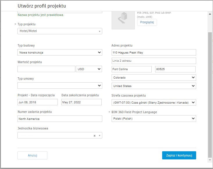W oknie dialogowym Utwórz profil projektu określ nazwę projektu i wprowadź informacje o projekcie. Wymagane pola są oznaczone gwiazdką. Niektóre pola, takie jak daty początkowe i końcowe, są używane do raportowania firmy i analizy, aby zapewnić wszystkim członkom zespołu dostęp do spójnych informacji projektowych w różnych procesach roboczych.