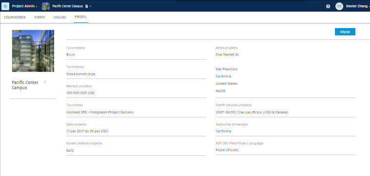 Administrator konta może edytować informacje o profilu, w tym obraz projektu. Można również dodać administratorów projektu do poprzednio utworzonego projektu. Informacje o profilu projektu są używane w całym programie BIM 360 oraz w raportach i analizach. Na przykład adres projektu jest używany do wyświetlania położenia projektu na mapie i warunkach pogodowych na stronie Project Home.