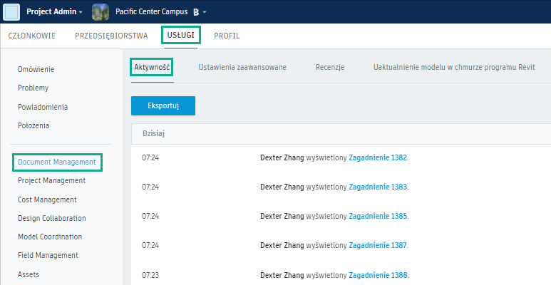 Po wprowadzeniu zmian w projektach używających modułu Document Management zostaną one zapisane w dzienniku Czynności. Czynność można wyświetlić i wyeksportować plik dziennika jako arkusz programu Excel na podstawie wybranego zakresu dat.