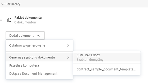Zanim będzie można wygenerować szablony dokumentów, administrator projektu musi utworzyć odpowiednie szablony dokumentów w obszarze Administrator projektu. Szablony są tworzone przy użyciu pól, które są automatycznie wypełniane danymi z systemu podczas generowania.