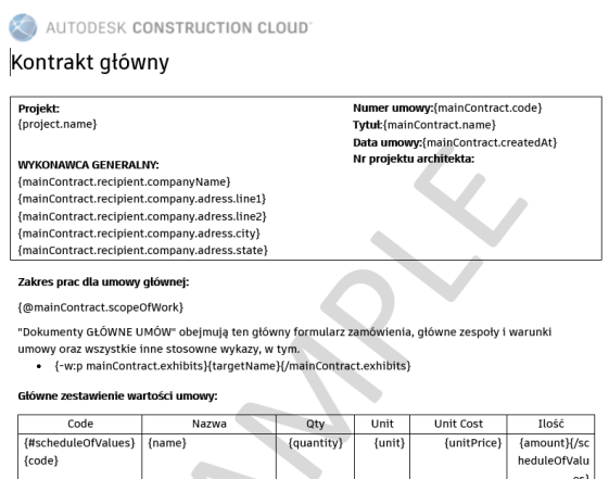 Pobrany szablon można dostosować do potrzeb firmy. Jednak zawartość w nawiasach musi pozostać taka sama, aby moduł mógł ją rozpoznać i automatycznie wypełnić podczas generowania dokumentu. Dowiedz się więcej na temat zmiennych.
