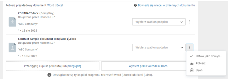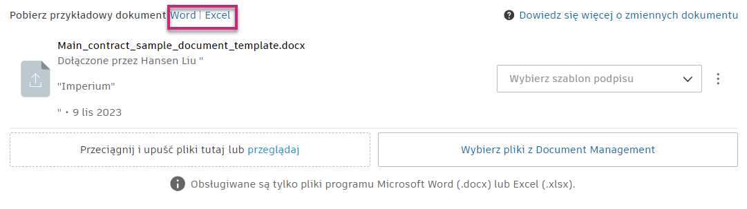 Wybierz opcję Pobierz przykładowy dokument, aby pobrać dostosowywalny szablon programu Word lub Excel. Można pracować z pliku programu Microsoft Word i dodawać zmienne do własnego pliku. Dowiedz się więcej na temat zmiennych dostępnych dla dokumentów.