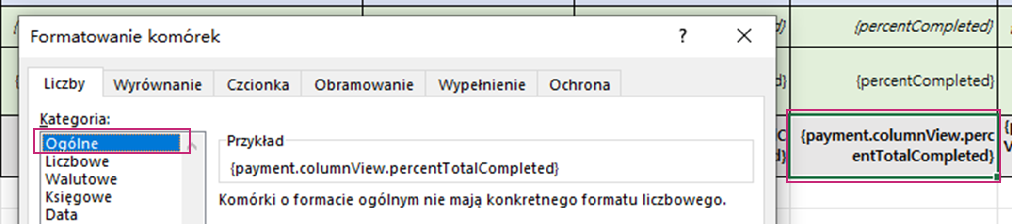% do każdej komórki kolumny, sformatuj komórkę jako typ ogólny i ręcznie dodaj znak % do komórki, na przykład {payment.columnView.percentTotalCompleted}%. Wzór jest odpowiedni tylko dla trybu kolumny aplikacji Cost Payment.Administratorzy mogą używać własnych komórek formatu Procent w programie Excel, definiując formułę procentową. Na przykład dla kolumny procentu całkowitego ukończenia aplikacji Cost Pay formułą zdefiniowaną przez użytkownika jest {completed | divide: revisedValue}.