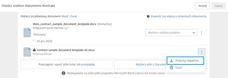 Może być konieczne przejrzenie zmiennych i ponowne przesłanie szablonu, gdy niektóre z używanych zmiennych są nieprawidłowe. Obok dokumentu, który wymaga sprawdzenia, zostanie wyświetlona ikona