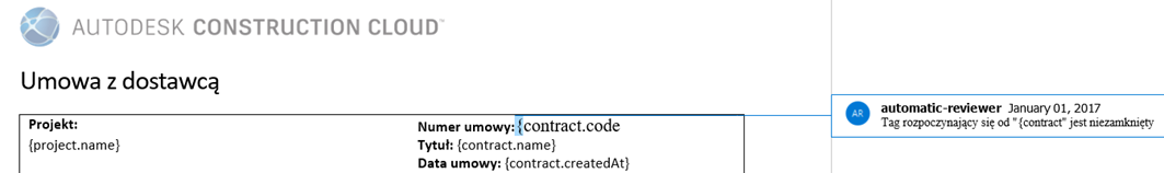 Szablon dokumentu rozpoczyna pobieranie. Otwórz pobrany szablon dokumentu. Komentarze będą widoczne obok nieprawidłowych zmiennych.