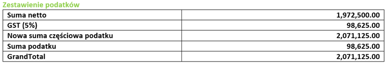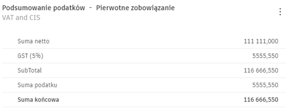 Za pomocą zmiennych podatkowych {#taxes} i {/taxes} można wygenerować listę podsumowania podatku. Na przykład, biorąc pod uwagę następujące podsumowanie podatku w module Zarządzanie kosztami: