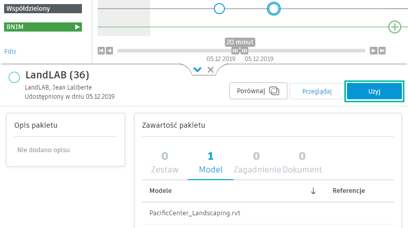 Korzystanie z pakietu oznacza, że pakiet innego zespołu został wprowadzony do środowiska. Celem nie jest posiadanie tego pakietu ani ponoszenie za niego odpowiedzialności, lecz raczej łączenie go z pracą zespołu i z pracą wszystkich innych zespołów. W modelu projektu będzie widoczny najnowszy model tego zespołu. Po podłączeniu do modelu innego zespołu w folderze Document Management połączenia również zostaną zaktualizowane.