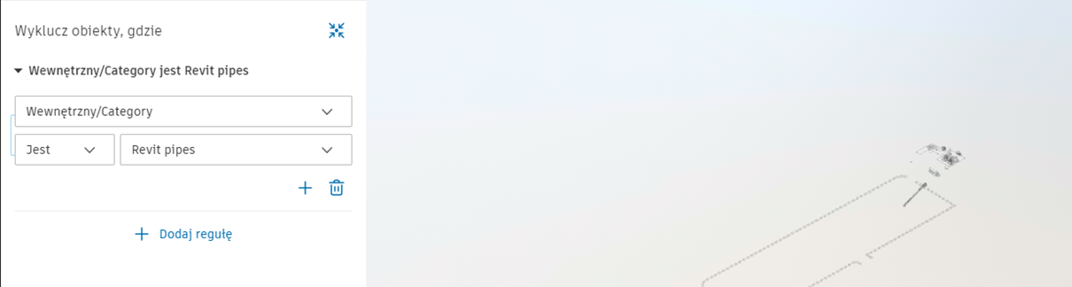 W razie potrzeby kliknij przycisk +, aby rozszerzyć regułę, dodając kolejną część reguły. "Dodanie kolejnych części do reguły dodatkowo zawęża wybrane obiekty modelu do tych, które pasują do wszystkich części reguły."