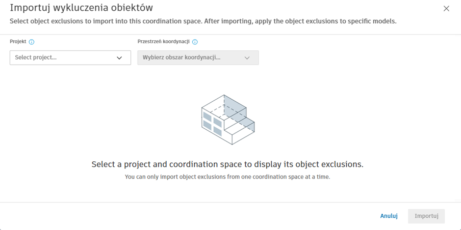 W oknie dialogowym Importuj wykluczenia obiektów należy wybrać projekt i obszar koordynacji w wybranym projekcie.