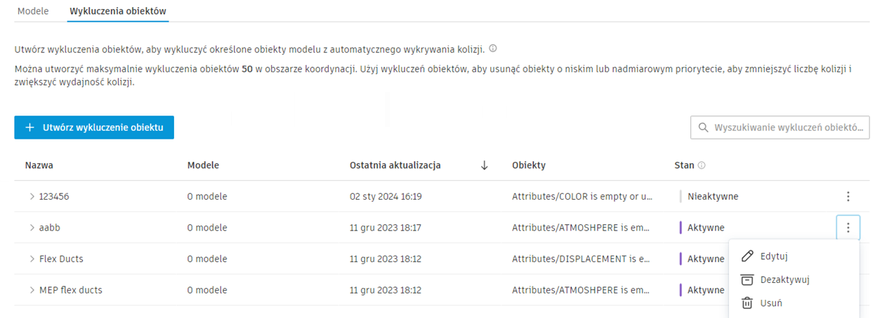 Wykluczenia importowanych obiektów zachowają nazwę wykluczenia obiektów, reguły i będą automatycznie aktywne. Jednak wykluczenia obiektów nie będą miały dodanych żadnych modeli i w związku z tym nie będą miały wpływu na sprawdzanie kolizji.