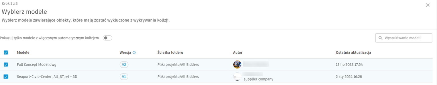"Wybierz modele, których obiekty chcesz wykluczyć z kolizji."