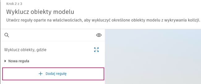 "Kliknij wykluczenie zaimportowanego obiektu, aby je otworzyć" Krok 1 z 3 Wybierz modele a następnie wybierz modele, które mają zostać uwzględnione w sekcji Tworzenie wykluczenia obiektu powyżej). Po dodaniu modeli i wykonaniu kroków uruchom ponownie sprawdzanie kolizji, aby zastosować je do obszaru koordynacji.