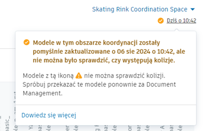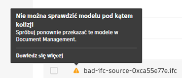 Określone modele będą oznaczone żółtą ikoną ostrzegawczą obok nazwy modelu na stronach Modele i kolizje. W tych modelach nie są wyświetlane żadne dane dotyczące kolizji, ponieważ wystąpił problem podczas przetwarzania modeli pod kątem kolizji.