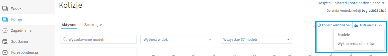 Kliknij opcję Modele lub Wykluczenia obiektów, aby otworzyć odpowiednią kartę na stronie Ustawienia kolizji.