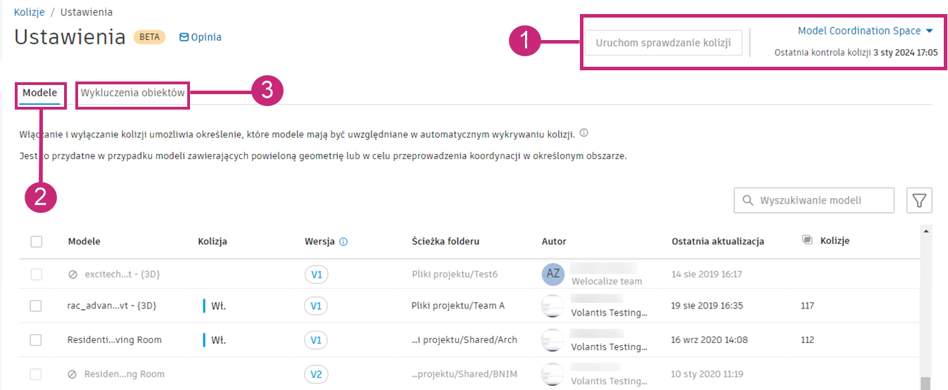Nowy test kolizji nie jest uruchamiany automatycznie po zapisaniu aktualizacji. Kliknij przycisk Uruchom sprawdzanie kolizji, aby ręcznie uruchomić nowe sprawdzanie kolizji. Jeśli nie klikniesz przycisku Uruchom sprawdzanie kolizji, najnowsze zapisane ustawienia zostaną uwzględnione w następnym teście kolizji wywołanym przez nowe przekazanie w obszarze koordynacji.