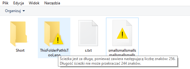 Podczas nawigowania w Eksploratorze plików systemu Windows plik/folder będzie miał specjalną ikonę wskazującą, że jego ścieżka przekroczyła ograniczenia, wraz z etykietą narzędzi wskazującą limit długości ścieżki i bieżącą długość ścieżki danego pliku/folderu.
