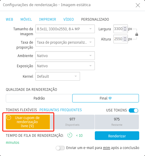 Se houver cupons de renderização disponíveis, eles poderão ser usados em vez de tokens flexíveis ou créditos da nuvem. Use esses cupons quando enviar uma renderização do Fusion, do Revit ou quando renderizar novamente na seção Minhas renderizações. Eles podem ser usados para renderizar qualquer tipo de trabalho em qualquer resolução.