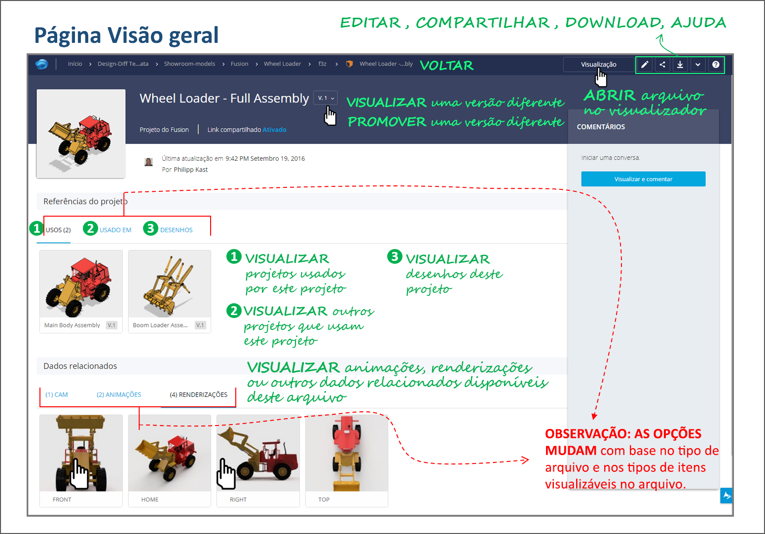 As informações em Referências de projeto e Dados relacionados dependem do tipo de arquivo. Em geral, essas informações são relevantes para os formatos de arquivo de projeto 2D e 3D. Se não houver dados relacionados disponíveis para um arquivo ou formato de arquivo (exemplo: arquivos do Office), você não verá esta seção na página Visão geral. Da mesma forma, a seção Referências de projeto é mostrada apenas para os tipos de arquivo relevantes.