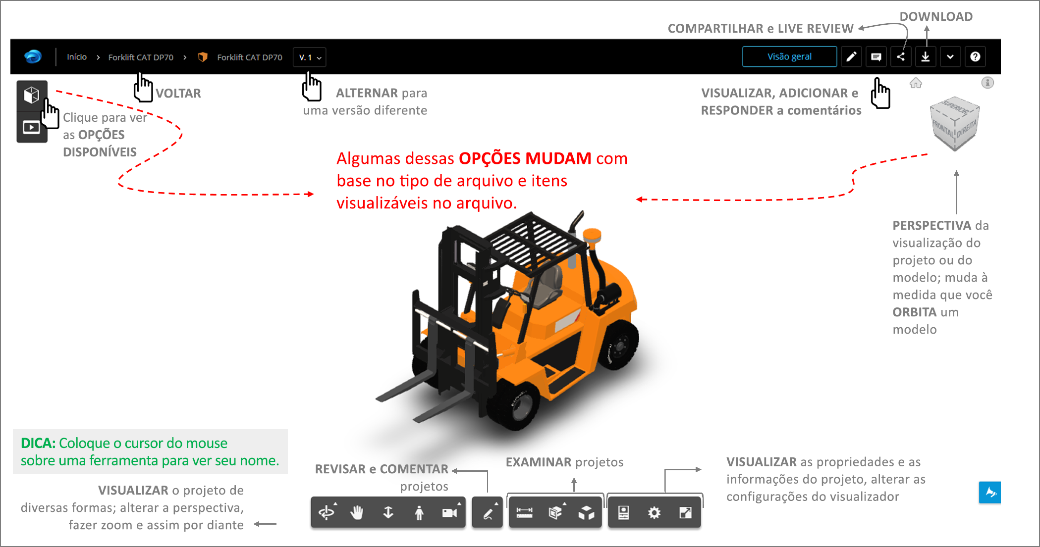 A imagem abaixo oferece um instantâneo do visualizador e uma introdução de alto nível às diferentes ferramentas disponíveis no visualizador. Dependendo do tipo de arquivo que você está visualizando, as opções nos cantos superiores direito e esquerdo e as ferramentas ao longo da parte inferior mudarão.