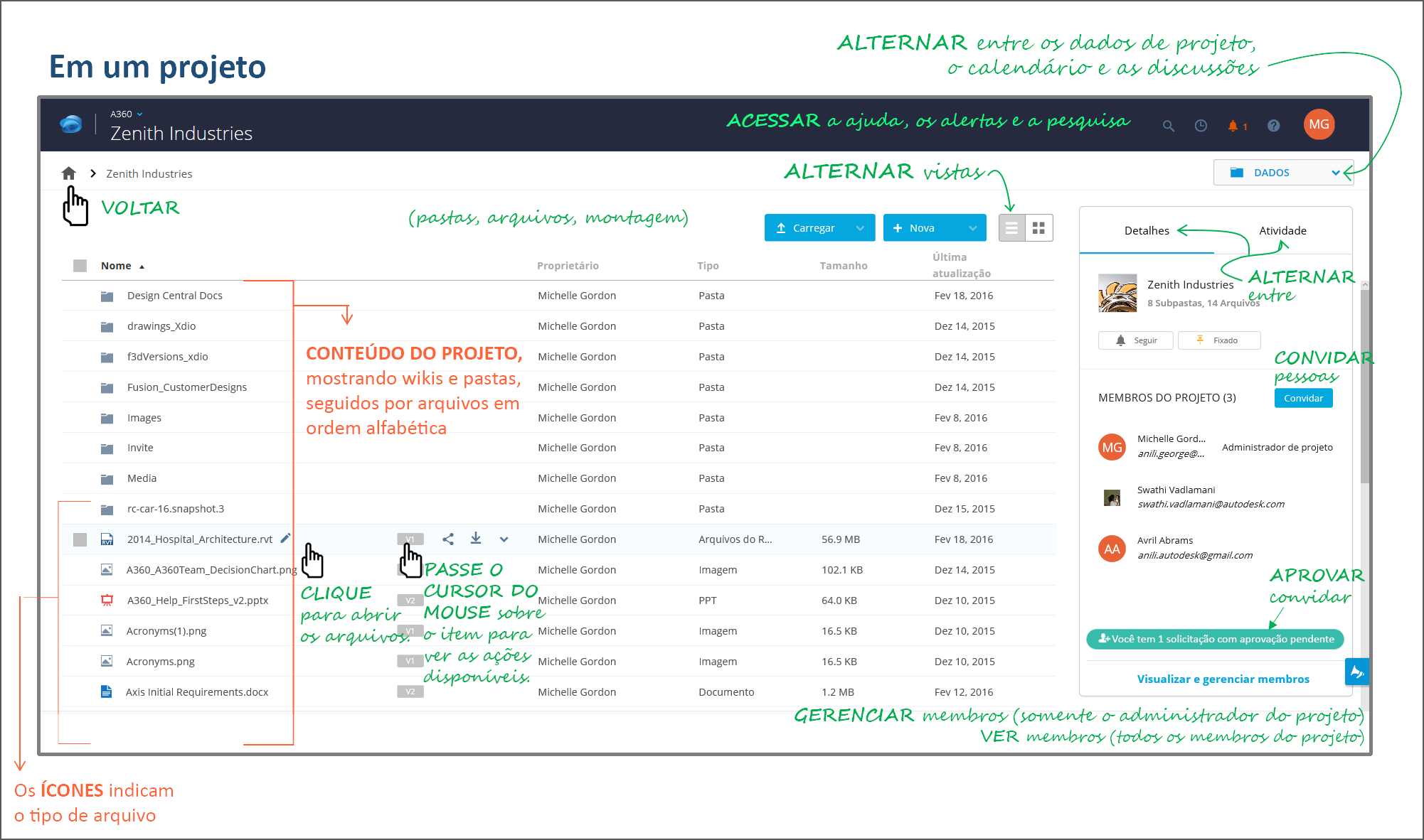 A seguinte ilustração fornece um layout em um projeto, as ações que podem ser realizadas na página e como navegar a partir desta página. O texto em laranja mostra como os espaços na página são organizados e o texto em verde chama a atenção para as ações que podem ser realizadas na página.