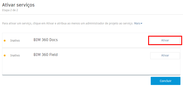 Importante: Após criar um perfil de projeto, você poderá ativar os serviços do BIM 360. Observe que você precisa ativar primeiro o Document Management para poder ativar outros