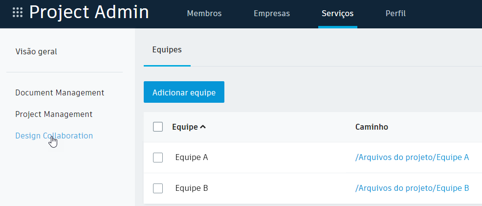 Antes de adicionar as equipes e gerenciar os membros da equipe, é importante entender o que acontece nos bastidores entre e a Design Collaboration e o Document Management quando uma equipe é adicionada. Para fazer isso, considere o seguinte exemplo em que duas equipes foram adicionadas: Equipe A e Equipe B.