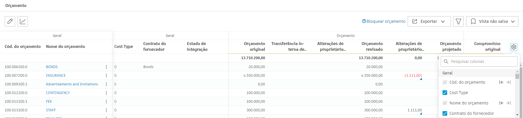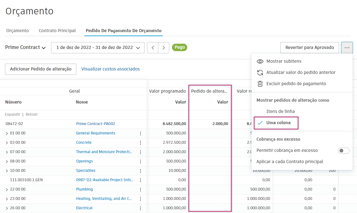 No caso do Contrato principal e do Pedido de pagamento de orçamento, o modo de coluna mostra OCOs aprovados.